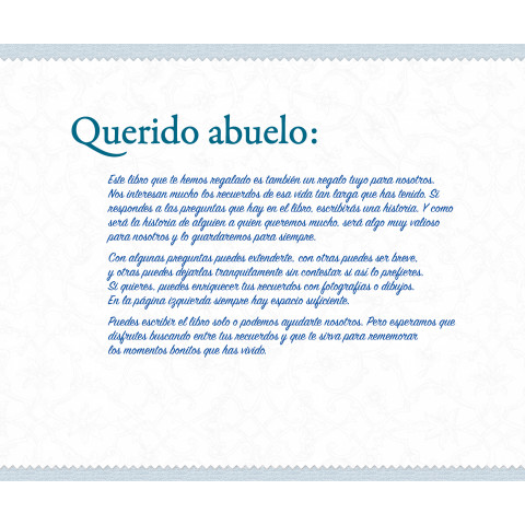 El libro “Abuelo, háblame de ti” es un original regalo para todos los abuelos. Unas preguntas cuidadosamente seleccionadas ayudan a plasmar y comprender la vida del abuelo desde su niñez hasta la actualidad. Será una experiencia divertida rellenar el libro, que después se convertirá en un valioso tesoro para toda la familia.